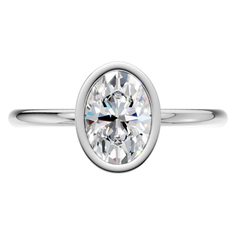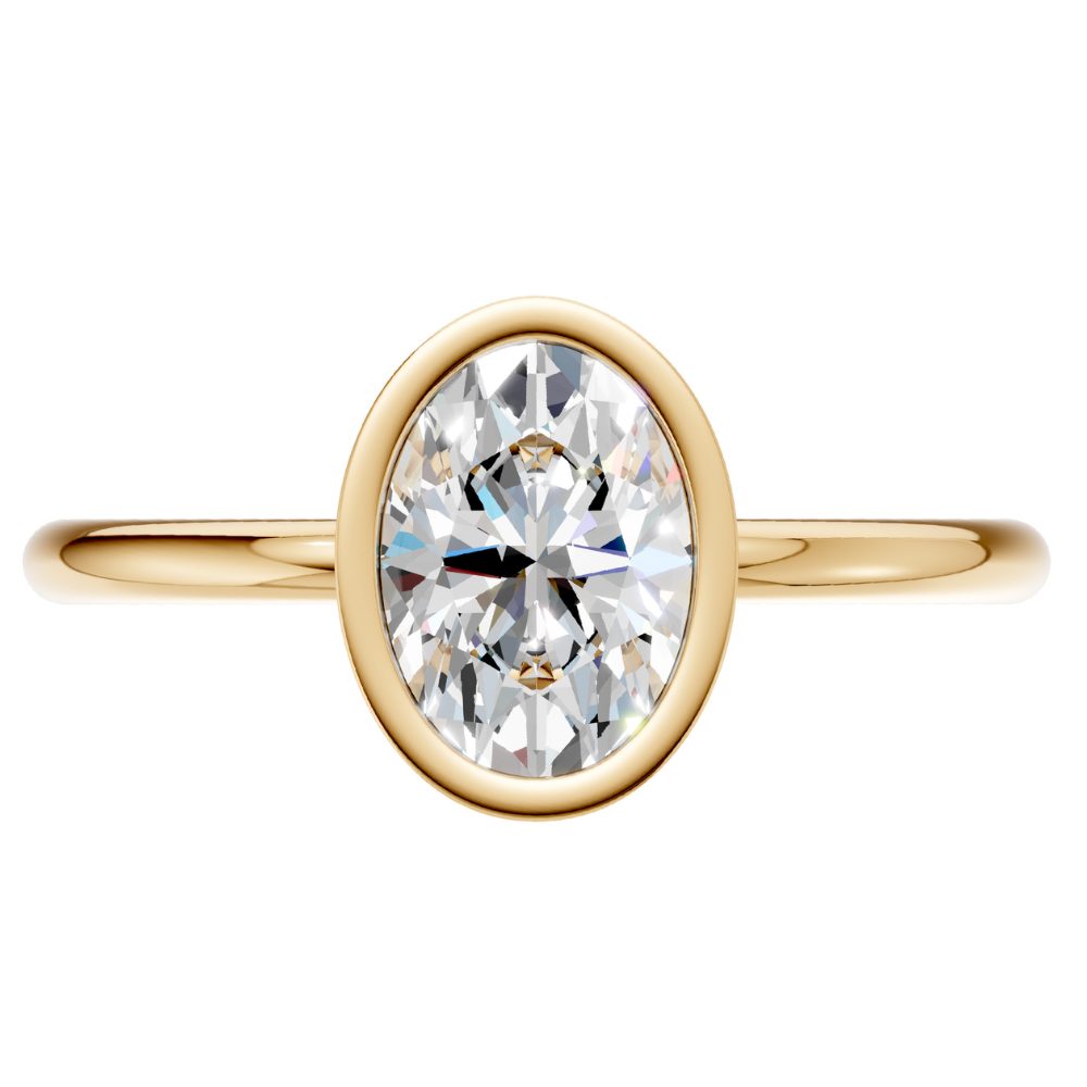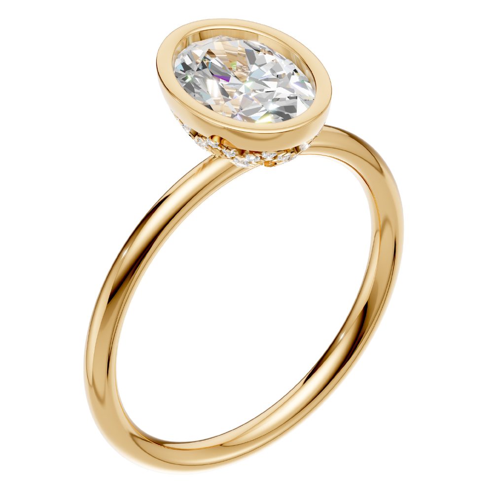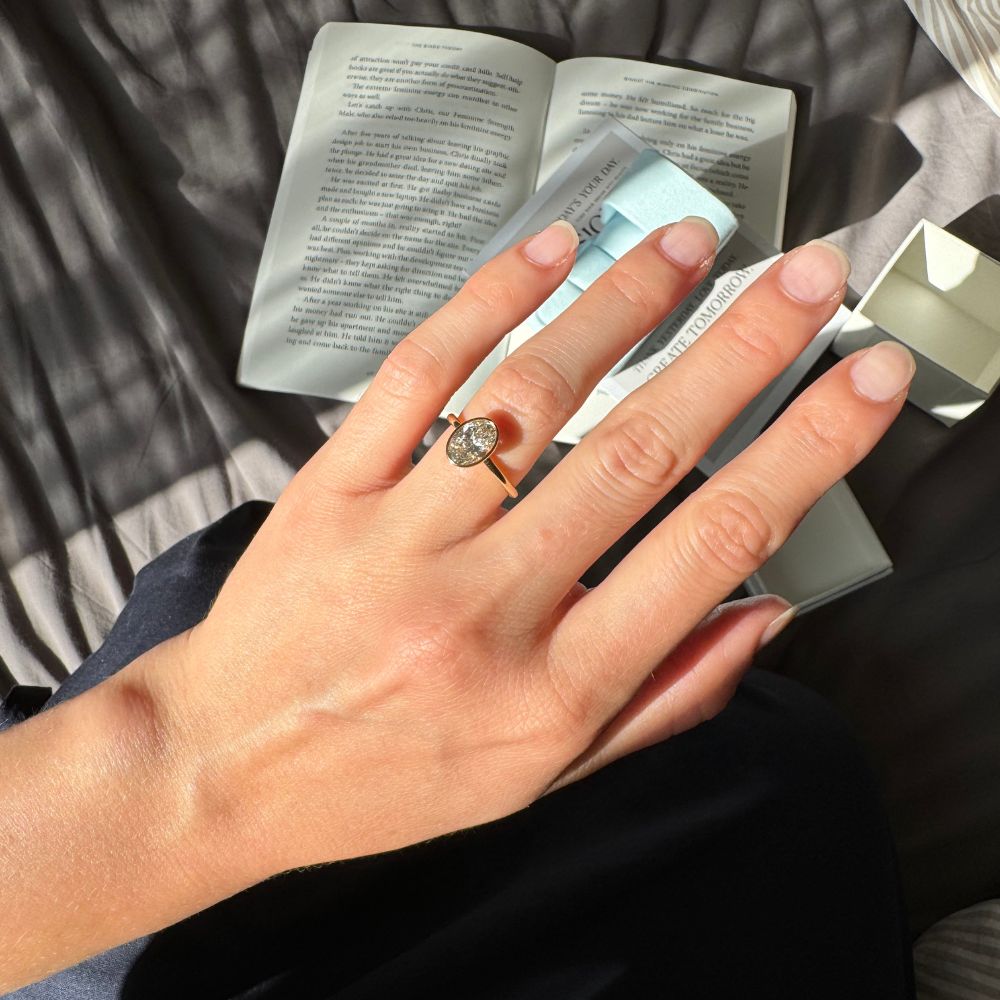 Im Mittelpunkt steht ein ovaler Labordiamant, gehalten in einer weich fließenden, zeitgemäß interpretierten Zargenfassung. Sie umrahmt seine feine, längliche Silhouette und verleiht ihm eine ruhige, feminine Leuchtkraft.