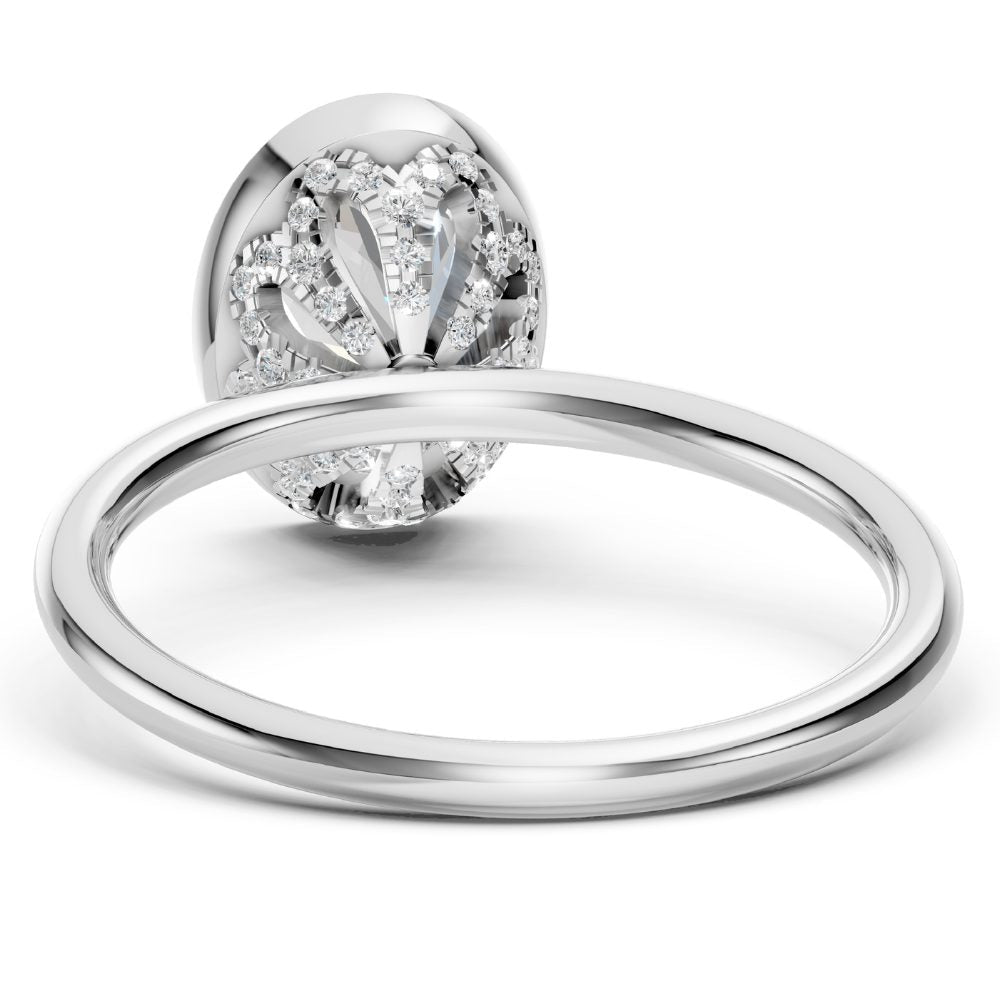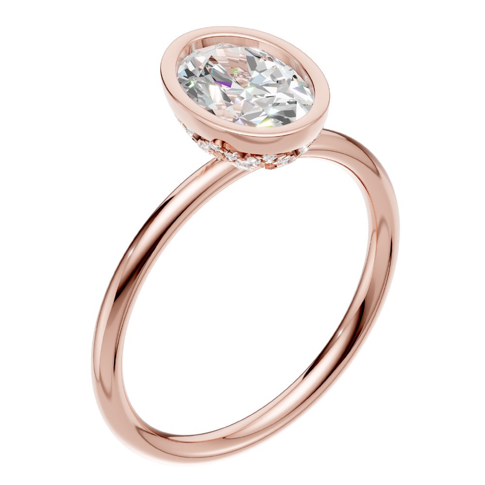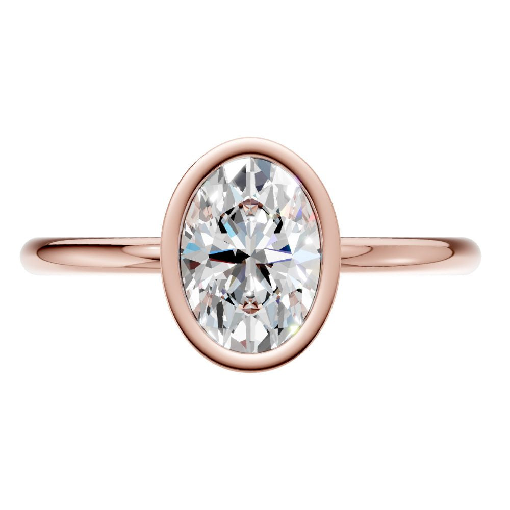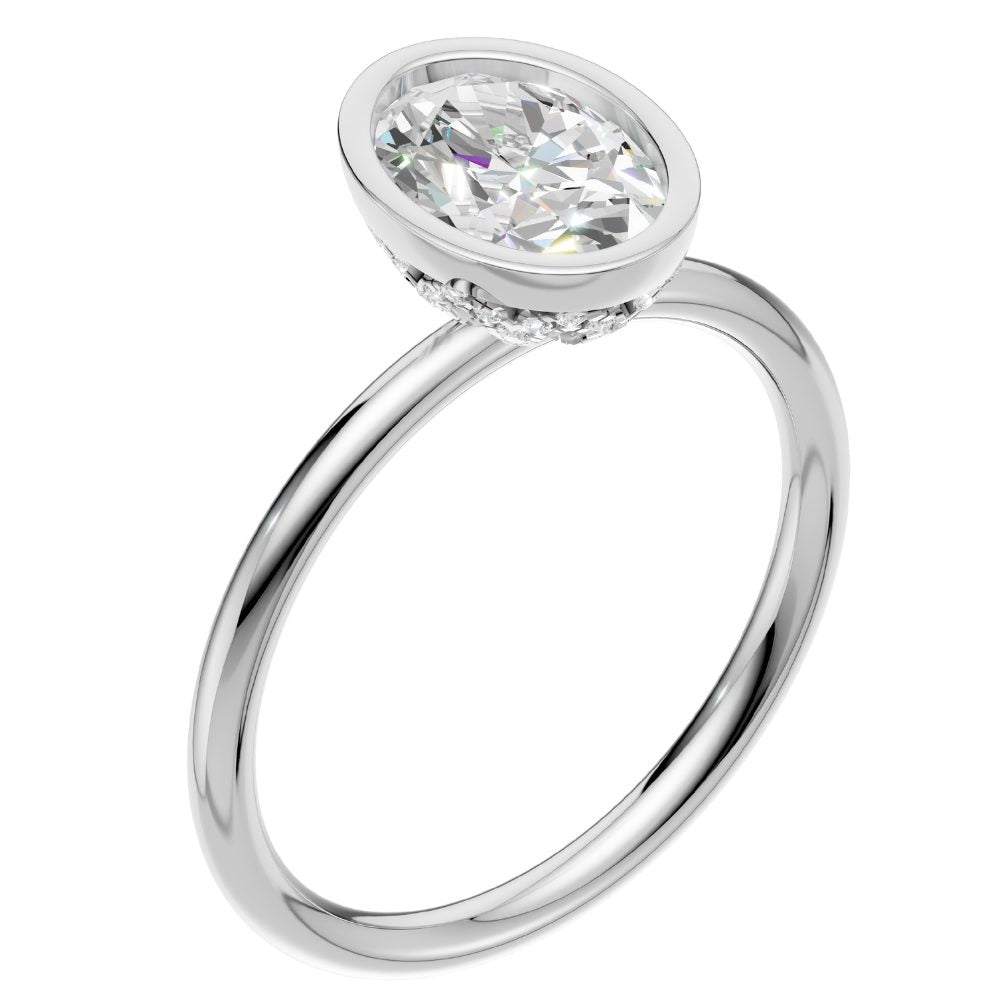 Im Mittelpunkt steht ein ovaler Labordiamant, gehalten in einer weich fließenden, zeitgemäß interpretierten Zargenfassung. Sie umrahmt seine feine, längliche Silhouette und verleiht ihm eine ruhige, feminine Leuchtkraft.