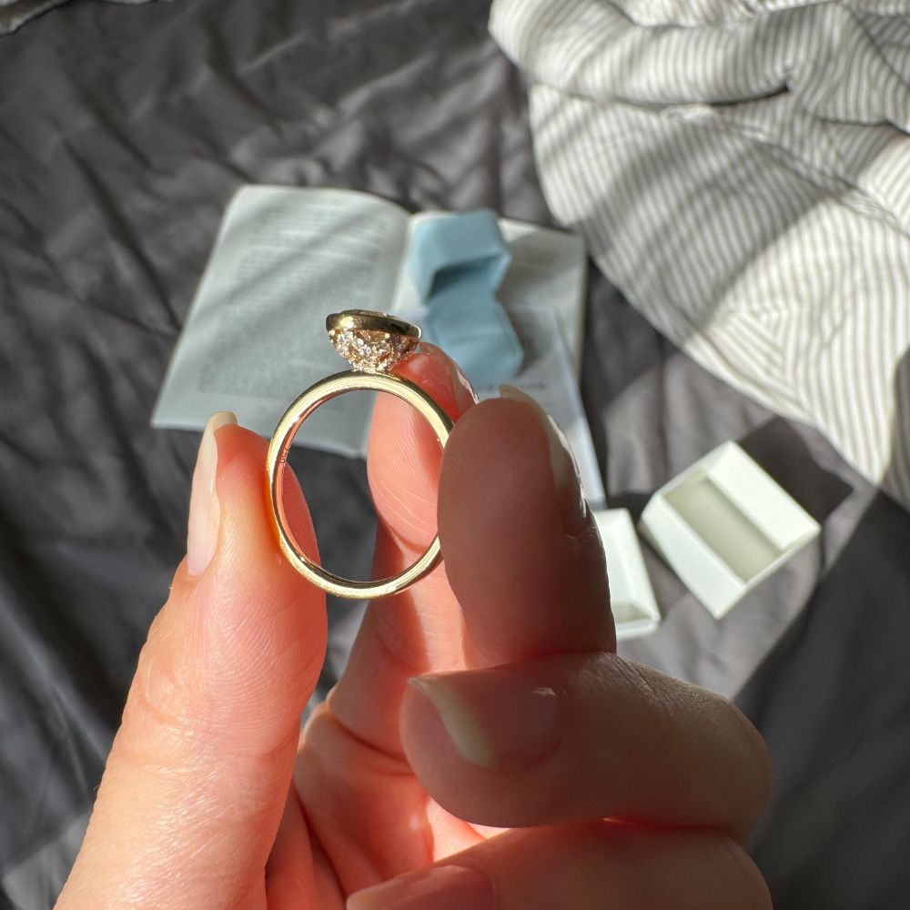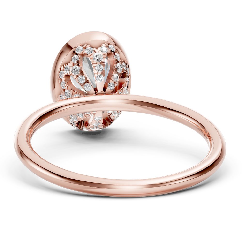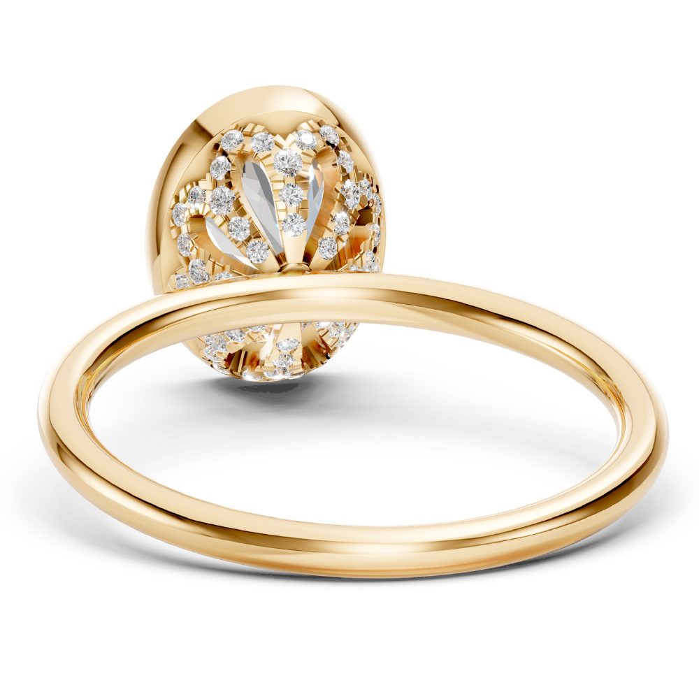 Auf der Rückseite entfaltet sich ein zartes Detail: kleine, kunstvoll gefasste Brillanten, ein verborgenes Funkeln, das nur die Trägerin für sich entdeckt. Die runde Ringschiene fügt alles zu einem stimmigen, eleganten Gesamtbild zusammen.