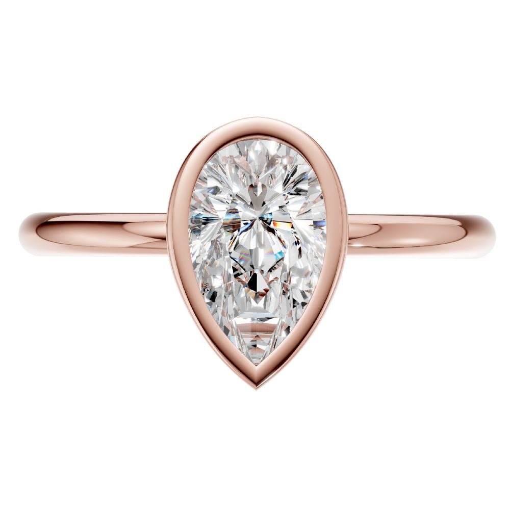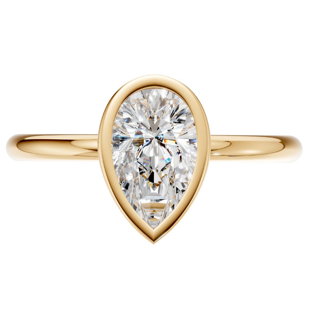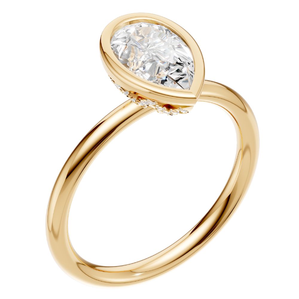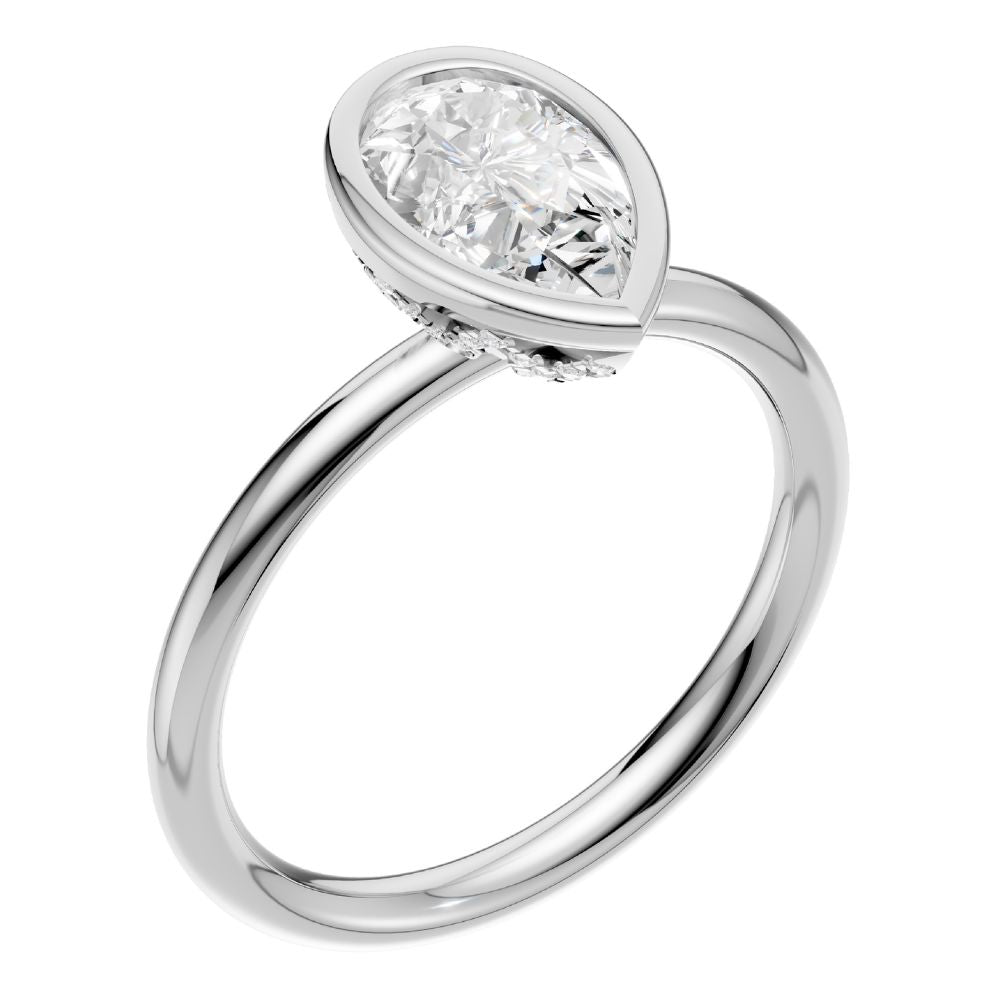 Im Mittelpunkt sitzt ein tropfenförmiger Labordiamant im Pear Cut, gehalten in einer sanft fließenden, modern interpretierten Zargenfassung. Sie betont die Form des Steins und verleiht ihm eine harmonische Ausstrahlung.