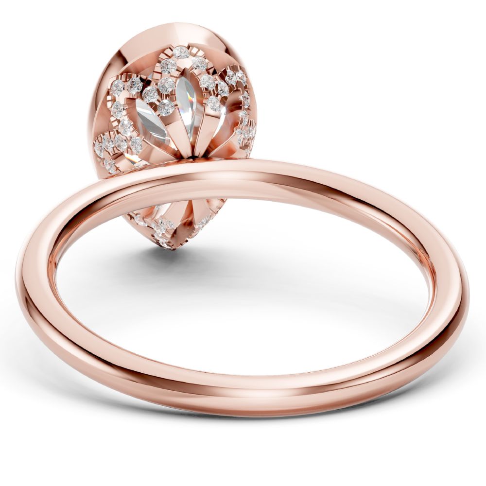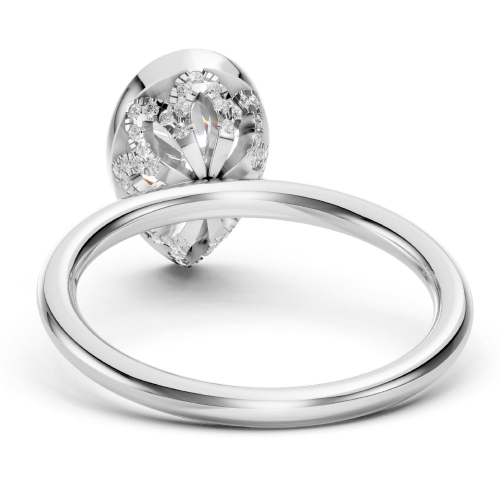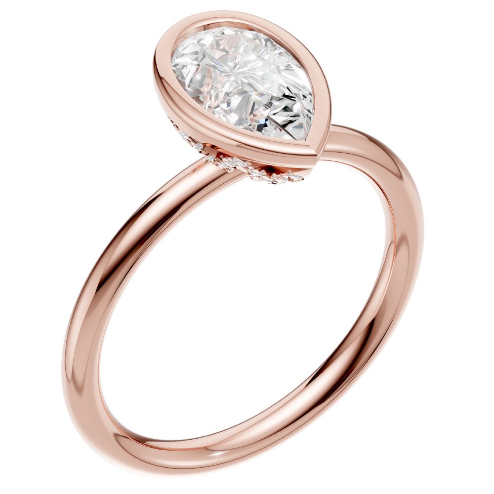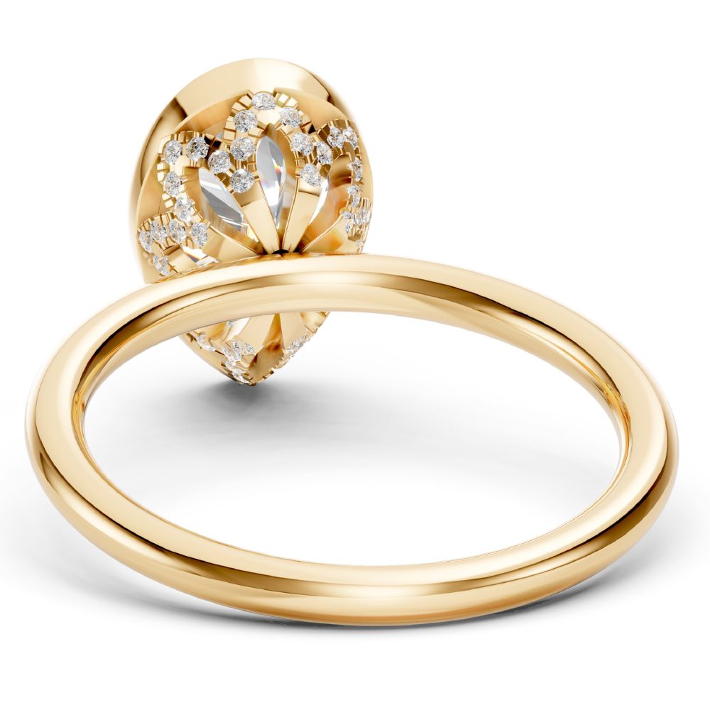 Im Mittelpunkt sitzt ein tropfenförmiger Labordiamant im Pear Cut, gehalten in einer sanft fließenden, modern interpretierten Zargenfassung. Sie betont die Form des Steins und verleiht ihm eine harmonische Ausstrahlung.