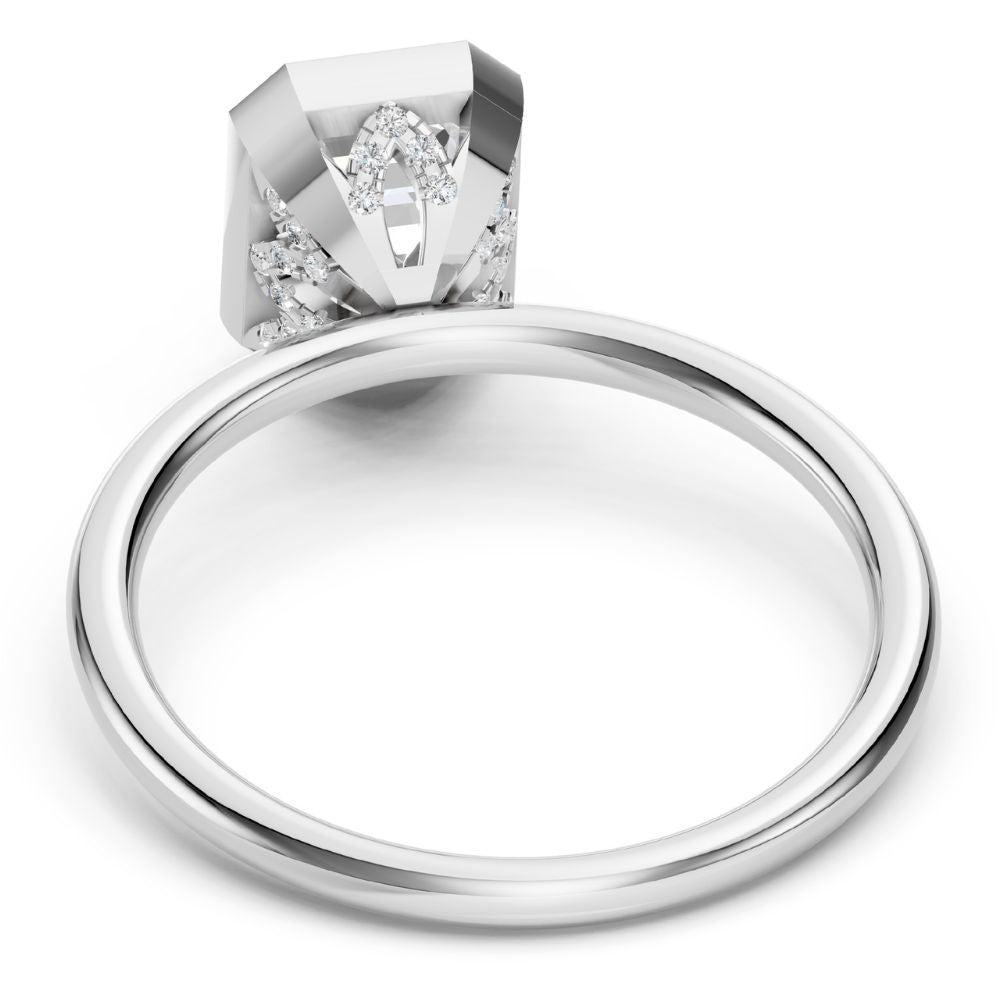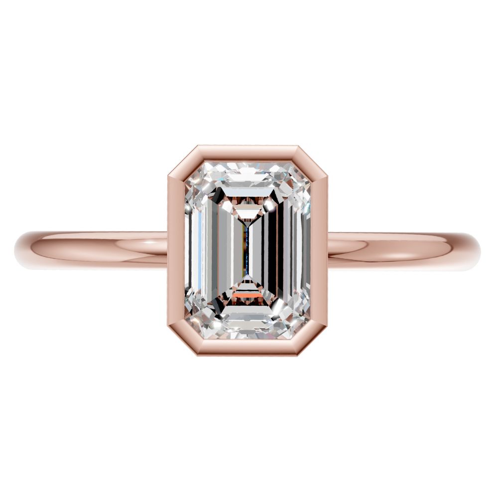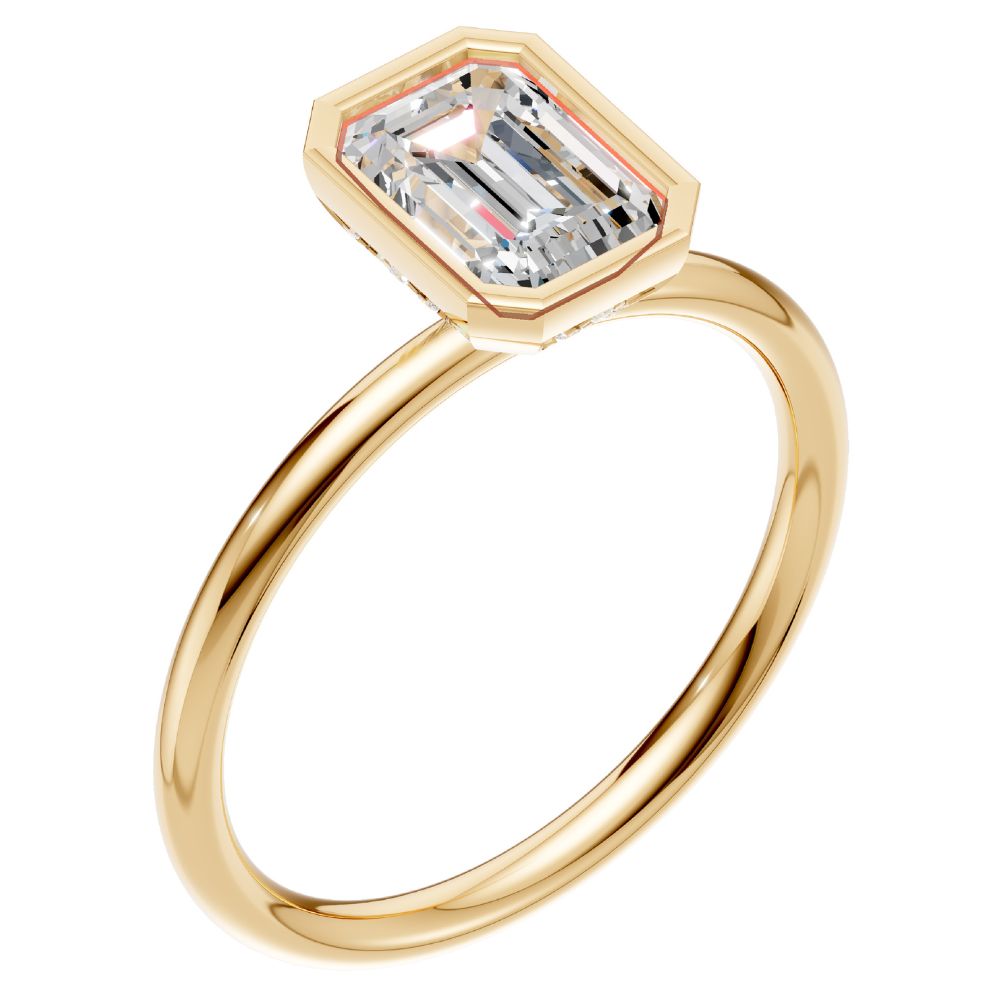 Im Zentrum steht ein rechteckiger Labordiamant im Emerald Cut, gefasst in einer sanft fließenden, modern interpretierten Zargenfassung. Sie betont seine präzisen Linien und verleiht dem klaren, spiegelnden Schliff eine weiche, harmonische Note.