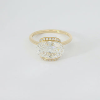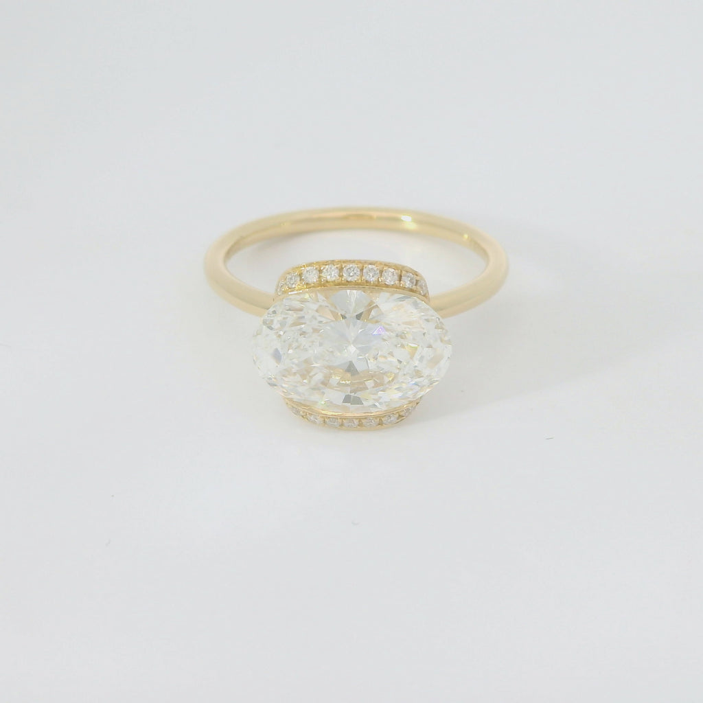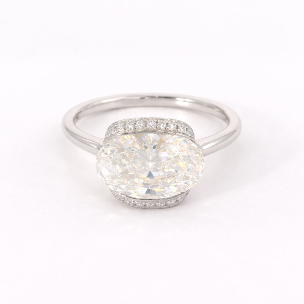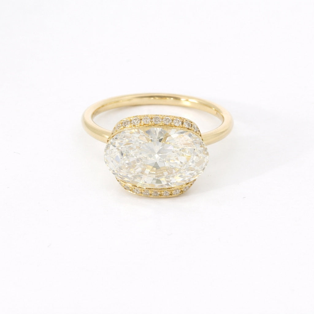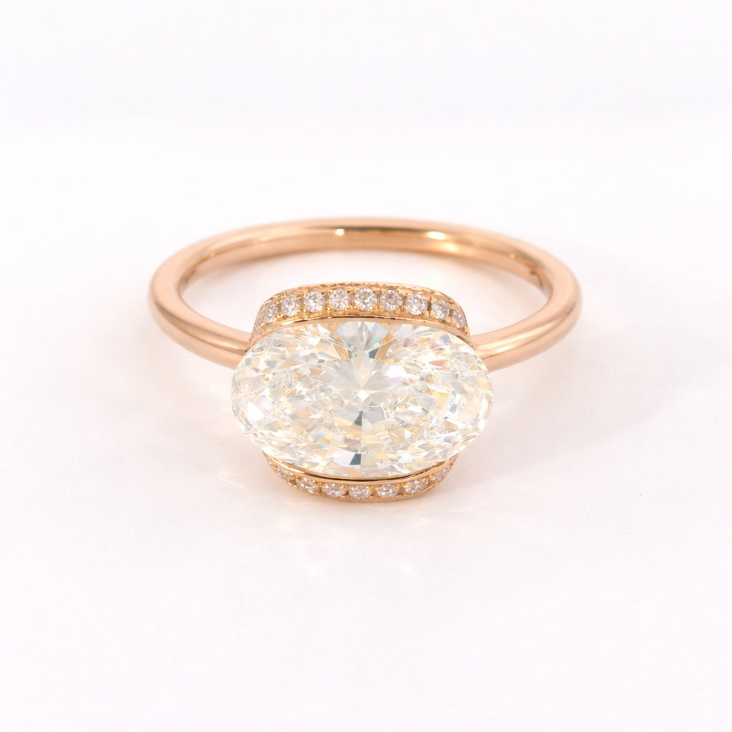 Caia ist für dich gemacht, wenn du einen klassischen Look liebst, der durch besondere Details eine neue Wirkung bekommt. Der ovale Diamant in East-West-Ausrichtung gefasst, steht im Mittelpunkt und sorgt für eine weiche, elegante Ausstrahlung. Eingefasst wird er von einem doppelseitigen Pavé-Rahmen, der den Stein sanft umspielt und ihm zusätzliche Präsenz verleiht.